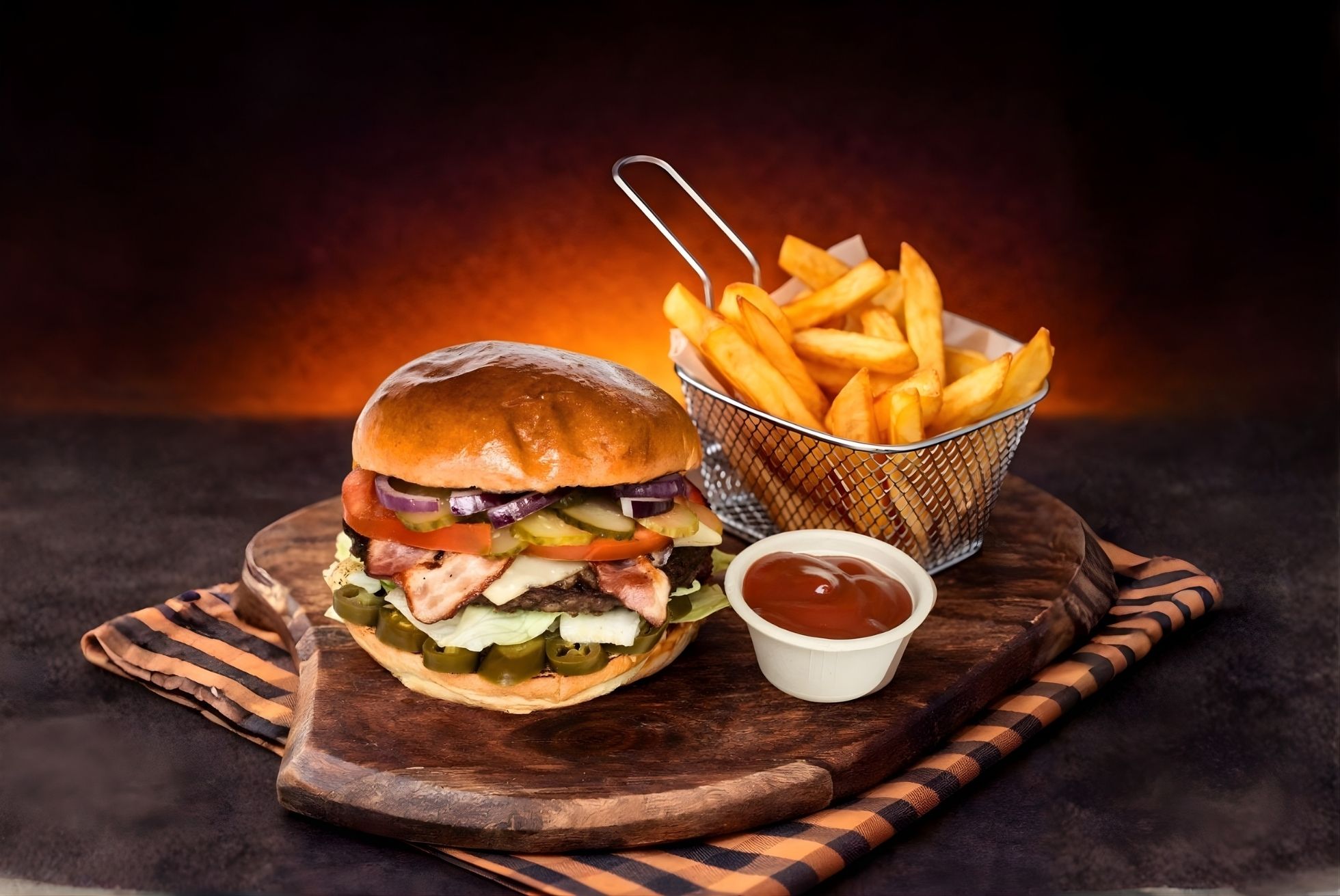 Pikantna 100% wołowina z goudą i chrupiącym bekonem, przełamana jalapeño i świeżymi warzywami, podana w maślanej brioche z duetem klasycznego i ostrego sosu. -